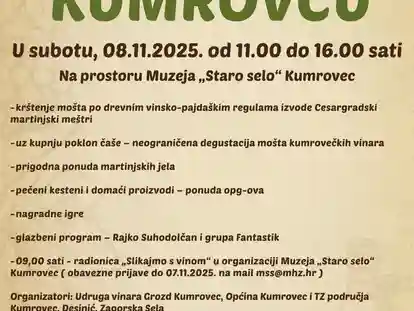 Martinje v Kumrovcu održat će se u subotu, 8. studenoga 2025. od 11 do 16 sati u prostoru Muzeja „Staro selo“, uz bogat program za sve generacije. Posjetitelje očekuje tradicionalno krštenje mošta prema starim vinsko-pajdaškim običajima koje će izvesti Cesargradski martinjski meštri, neograničena degustacija mošta kumrovečkih vinara uz kupnju poklon čaše, kao i prigodna ponuda martinjske hrane.